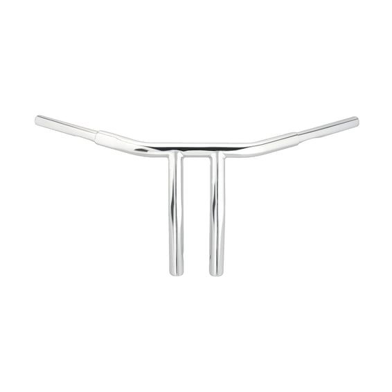 Chrome; Steel; With 3-1/2" center to center spacing to fit standard style triple trees. 1/2-13 threaded and is pre-drilled for internal wiring. Approx. dimensions: 10" rise; 6.5" end rise; 30.5" wide; 8" pullback, 25° wrist angle