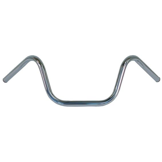 Chrome; Steel; Not dimpled; With 3 slotted holes for internal wiring; This comes with approval; Approx. dimensions: 22cm rise x 70cm wide x 20cm pullback Note: Check your local MCS dealer or the MCS sales department for exact type of approval and validity on bike model and years on the test report.