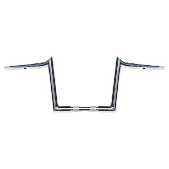 Chrome plated finish. Dimpled and drilled for internal wiring. With smooth inside corners to prevent wiring damage and ease in wiring pull-through. Works with or without e-throttle. Approx. dimensions: 10" rise x 34.5" wide x 9" center width x 9" pullback and a 28° wrist angle. Note: Fits models with 1" diameter riser clamp area only.