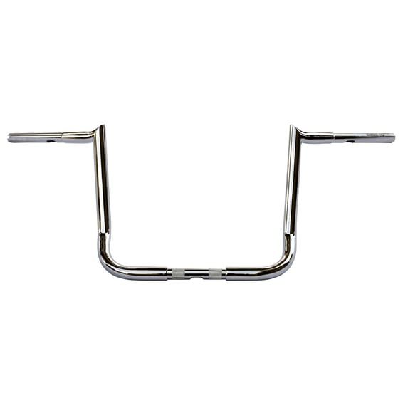 Chrome plated finish. Dimpled and drilled for internal wiring. With smooth inside corners to prevent wiring damage and ease in wiring pull-through. Works with or without e-throttle. Designed to fit the batwing fairings as found on FLHX, FLHT, FLHTC, Limited and Ultra Classic models. Approx. dimensions: 14" rise x 6" wide x 9" pullback x 14" center width and a 37° wrist angle. Note: Fits models with 1" diameter riser clamp area only.