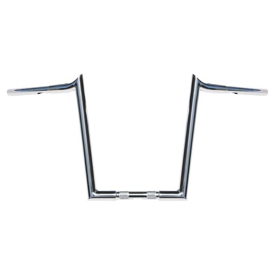 Chrome plated finish. Dimpled and drilled for internal wiring. With smooth inside corners to prevent wiring damage and ease in wiring pull-through. Works with or without e-throttle. Approx. dimensions: 14" rise x 35.5" wide x 9.5" center width x 9" pullback and a 28° wrist angle. Note: Fits models with 1" diameter riser clamp area only.