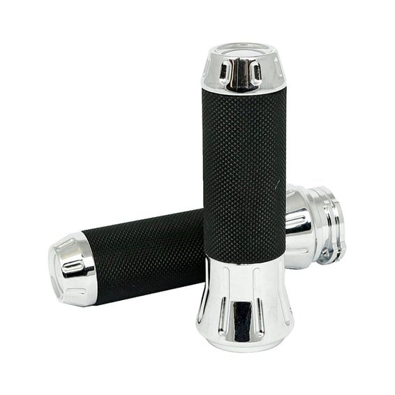 Chrome plated. CNC machined aluminum in combination with stylish rubber inlays make these design grips way more than just great to ride with. Fits 1" diameter handlebars and will take single or dual throttle cables.