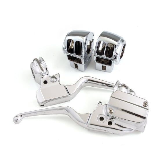 Chrome plated OEM style handlebar control kit. Complete with switch housing, without stock style switches and wiring.