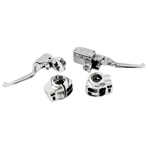 Chrome plated OEM style handlebar control kit. Complete with switch housing, without stock style switches and wiring.