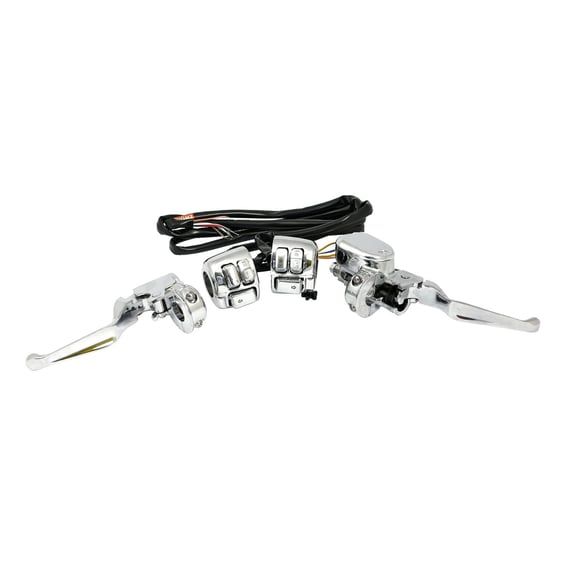 Chrome plated OEM style handlebar control kit, single disc models. Complete with switch housing and stock style switches and wiring.