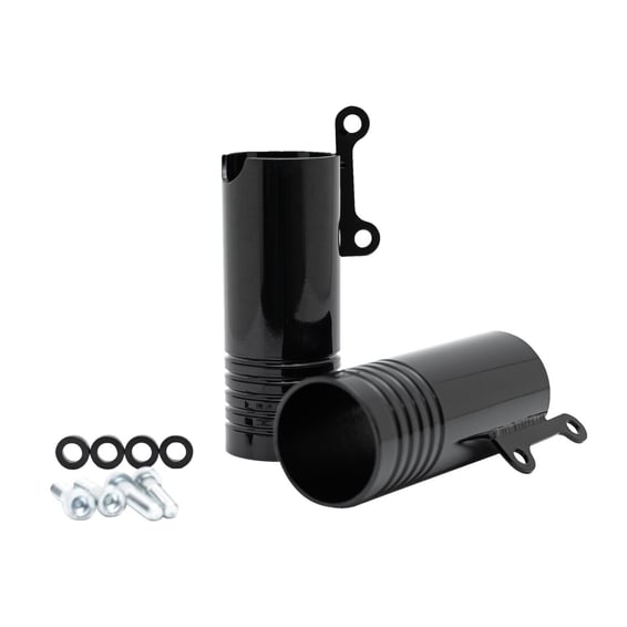 CNC machined billet aluminum with a gloss black powder coated finish. Designed to cover the lower fork tubes of the upside down fork. This transforms the fork to a massive blackout Fat Fork look. Installs directly to the caliper mounts.