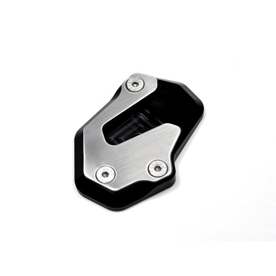 The sidestand foot increases and improves the supporting surface and the stability on unpaved and soft ground. CNC milled from high strength aluminum and black anodized. The clamping plate and inluded screws are made from stainless steel.