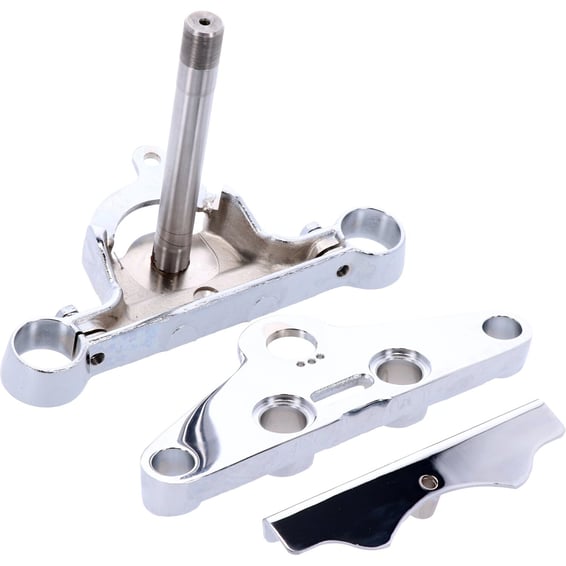 Chrome plated steel. OEM style, incl. lower tree cover. Accepts late model handlebar dampers and riser clamps with 3-1/2" spacing. With built-in 1.5 degree positive rake. 45665-80A / 45665-84B (bottom), 45672-80 (top),